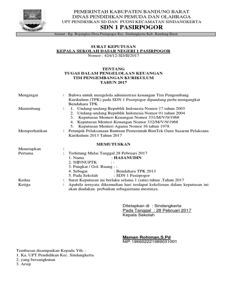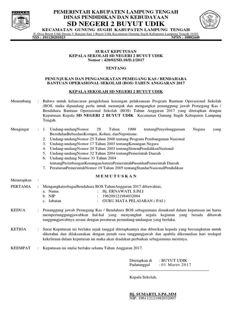 Keputusan kepala sd negeri patia 2 kecamatan patia nomor : Contoh sk bendahara bos sd/mi. Tim pengelola bos yang terdiri dari ketua tim pengelola, sekretaris, bendahara, dan anggota. 3 4 25 sk bendahara bos sekolah sd smp sma smk bendahara bos. Untuk anggota terdapat unsur guru dan wali murid serta komite sekolah.