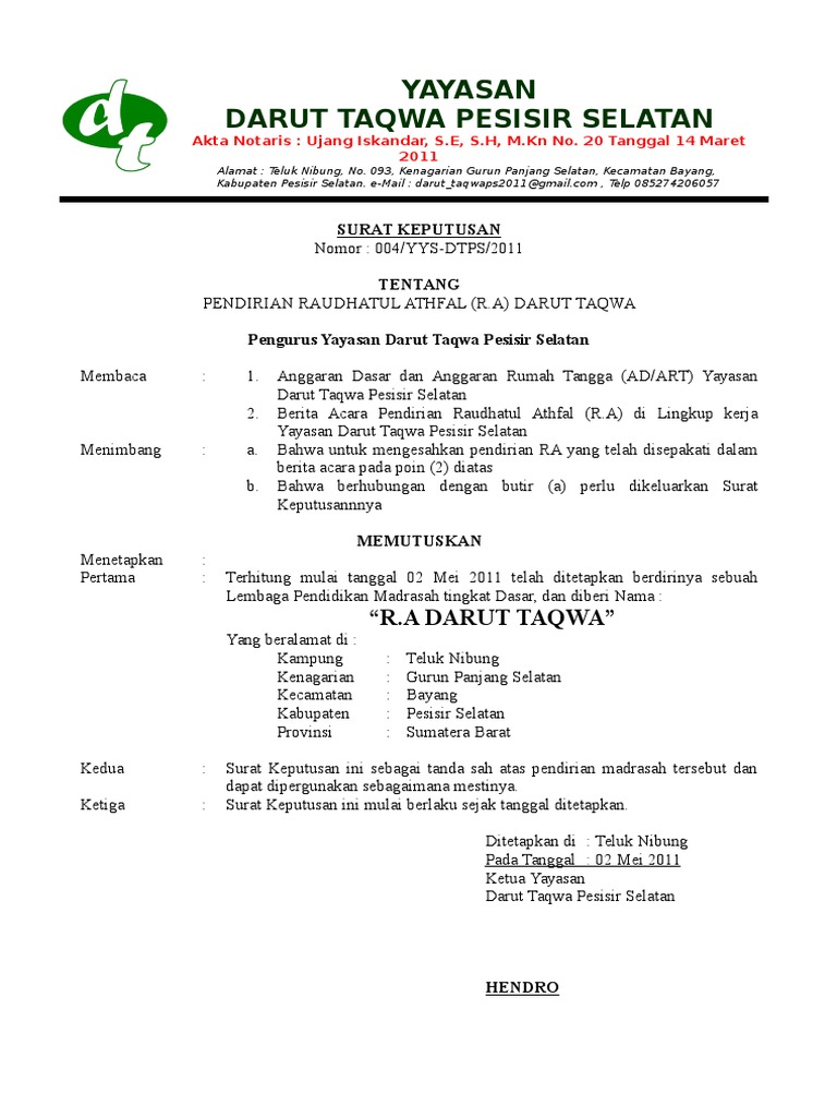 Dalam surat keputusan pendirian biasanya dijelaskan apa saja profil paud tersebut sampai ke organisasi yang ada didalamnya. Yayasan bakti insan mandiri (yabima) akte notaris : Yayasan * surat penugasan * file dalam format pdf dengan ukuran max. Sebagai lembaga yang memberikan upaya perlindungan bantuan dan pelayanan kepada masyarakat di bidang sosial keagamaan dan kemanusiaan. The collection that consisting of chosen picture and the best among. Yakobus merauke provinsi papua ketua badan pengurus yppk merauke surat rekomendasi vikaris jenderal keuskupan agung merauke Contoh surat keputusan sk pendirian paud tk kb tpa sps. Status badan hukum bagi yayasan baru timbul setelah akta pendirian yayasan. Sk pengesahan pendirian badan hukum berbentuk yayasan diterbitkan oleh direktorat jenderal administrasi hukum umum kementerian hukum dan hak asasi manusia. Sebuah lembaga paud harus memiliki surat keputusan pendirian lembaga karena merupakan cikal bakal lembaga paud yang akan didirikan. Agar lebih memudahkan lagi dalam. Yayasan dapat didirikan oleh satu orang atau lebih dengan cara memisahkan sebagian harta pendirinya untuk dijadikan kekayaan awal yayasan. Peraturan pendirian yayasan oleh orang asing.